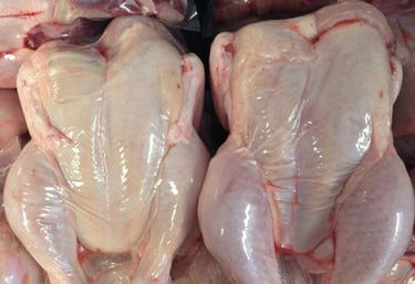 Hygienically processed whole chickens meeting commercial food safety standards.